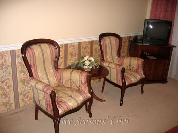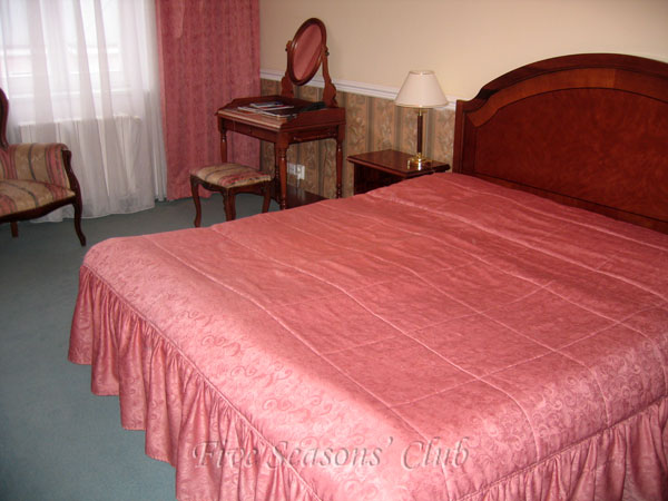 В номере: ванна, душ, туалет, телефон, телевизор, холодильник, фен, халат, в апартаментах - мини-кухня (~5 кв.м) с электроплитой и полным набором посуды и приборов, сейф (в номере и на ресепшн). Балкон - в апартаментах и в некоторых двухместных номерах. Все кровати - с ортопедическими матрацами.