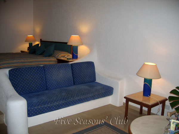 Белое здание в традиционном стиле «под античность» построено так, будто наполовину спрятано в земле, уютный и просторный лобби с потолком, отделанным тростниковым деревом, сразу располагает к отдыху.